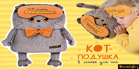 Kp34-229. Подушка кот Басик с вышитой мордочкой. На коте-подушке галстук‑бабочка и маска для сна.